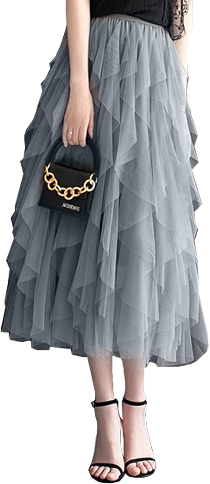 Amazon 水田亜木 チュールスカート 春 夏 秋 ロングスカート マキシ 無地 レース 不規則 ミモレ Aライン レース ハイウェスト 通勤 通学 レディース グレー スカート 通販